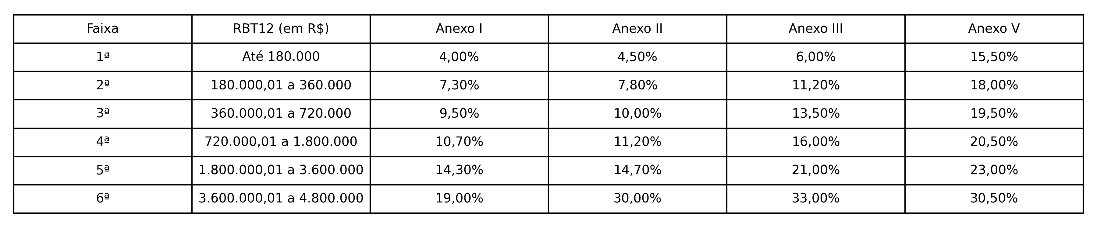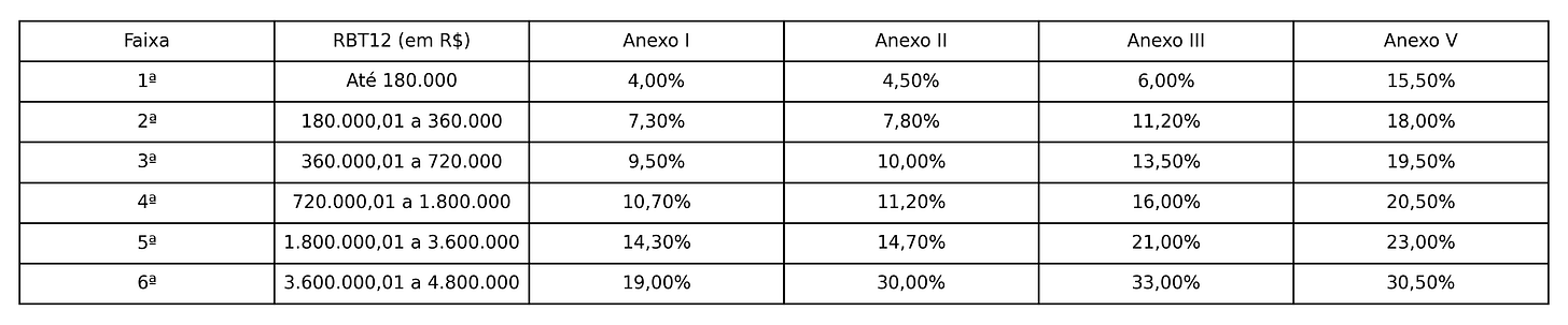 Tabela resumo dos anexos e alíquotas iniciais (2026)