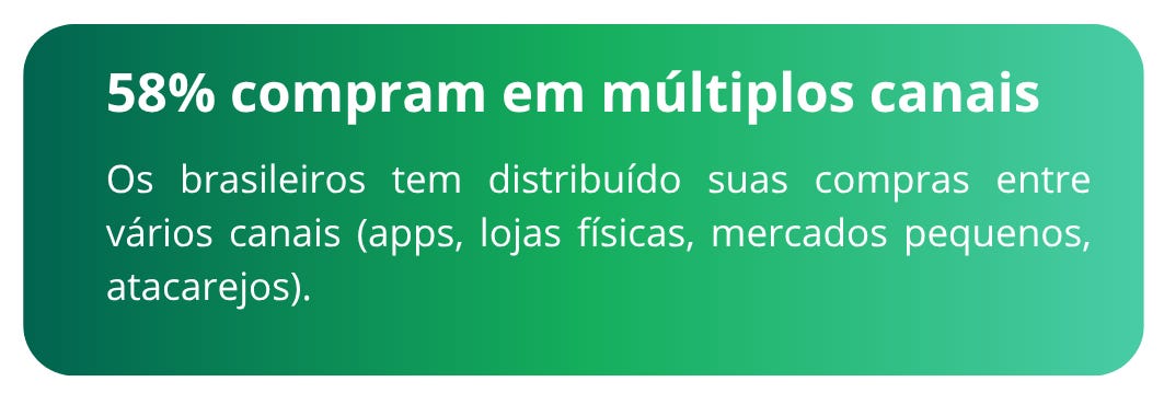 Diversificação de canais: 58% dos brasileiros compram em mais de um lugar (aplicativos, mercados locais, atacarejos) em busca dos melhores preços.