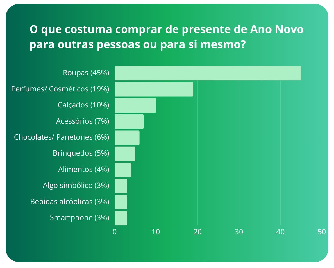Entre os presentes mais escolhidos, os vestuários ganham disparados, afinal, é uma tradição muito forte em nossa cultura usar roupas novas na virada do ano.